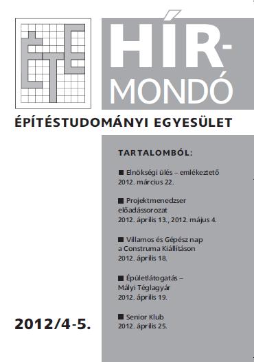 Az ÉTE Hírmondó 2012/4-5. számából egyebek között megtudható, hogy június 1-jén rendezzük meg - szakmai szervezetekkel együtt - az Építők Napja ünnepséget. Továbbá tájékoztatást adunk a márciusi kibővített elnökségi ülésről illetve a szakosztályok, régiók április-májusi programjainak listája, és beszámoló a szakmai programok is megtalálhatóak.